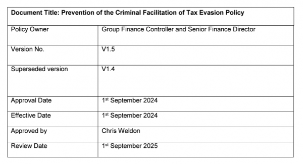 Prevention of the Criminal Facilitation of Tax Evasion Policy
