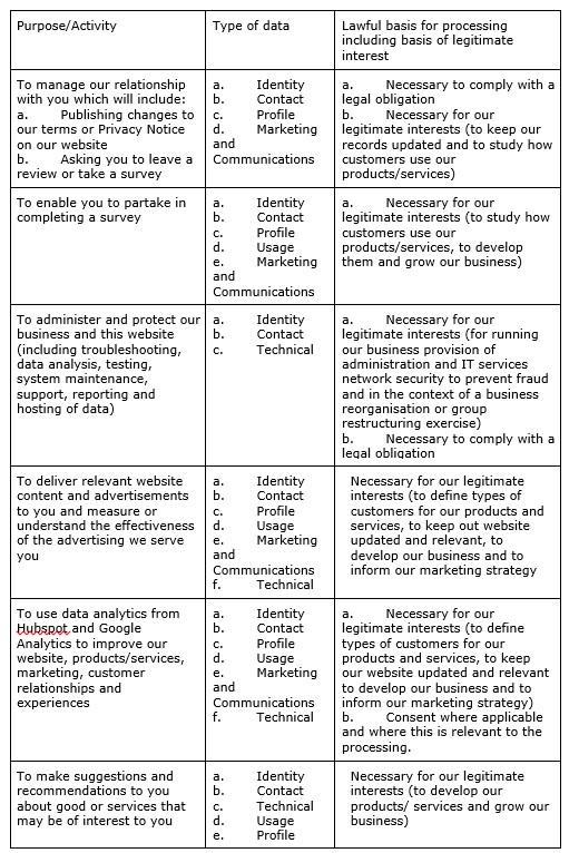 See the table below to find out more about the types of lawful basis that we will rely on to process your personal data. Note that we may process your personal data for more than one lawful ground depending on the specific purpose for which we are using your data.